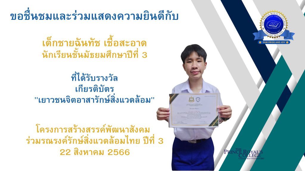 รางวัลเกียรติบัตร”เยาวชนจิตอาสารักษ์สิ่งแวดล้อม” โครงการสร้างสรรค์พัฒนาสังคม ร่วมรณรงค์รักษ์สิ่งแวดล้อมไทย ปีที่ 3 เนื่องในวันสิ่งแวดล้อมไทยประจำปี 2566