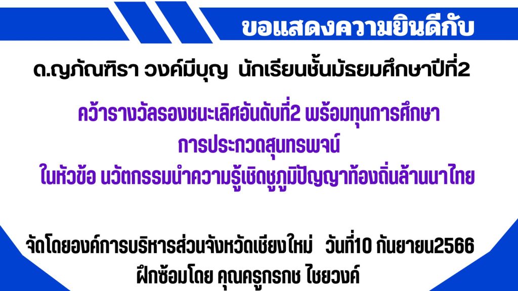 ขอชื่นชมและร่วมแสดงความยินดีกับ เด็กหญิงญาณชาดา สิงห์ใจ […]