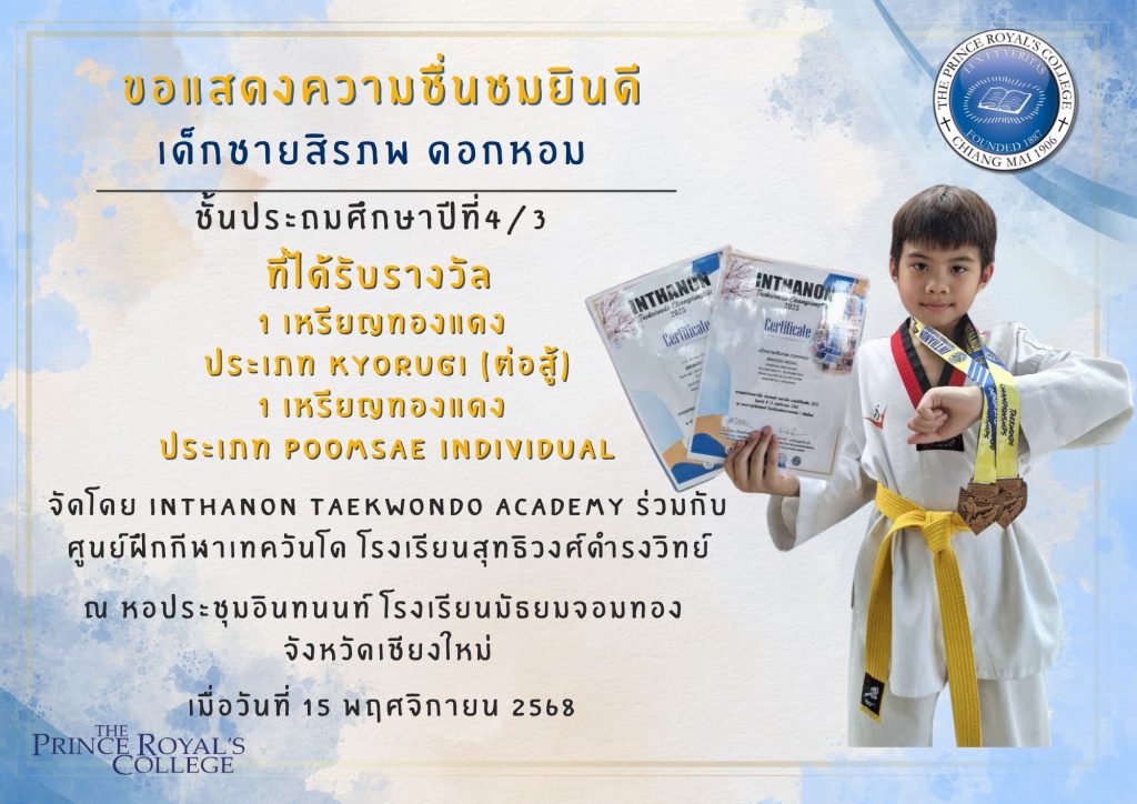 เด็กชายสิรภพ ดอกหอม แข่งขันกีฬาเทควันโด INTHANON TAEKWONDO CHAMPIONSHIP 2025