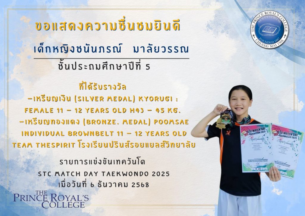 เด็กหญิงชนันภรณ์ มาลัยวรรณ นักเรียนระดับชั้นประถมศึกษาปีที่ 5 รายการแข่งขันเทควันโด STC MATCH DAY TAEKWONDO 2025