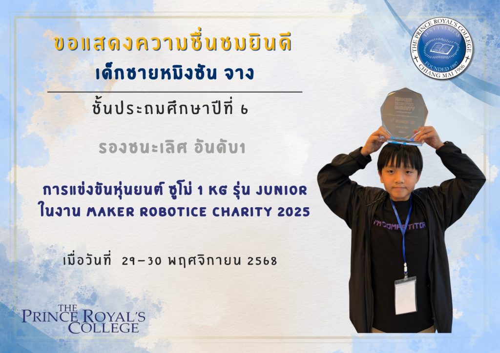 เด็กชายเยเรมีย์ ประดิษฐสอน รางวัลอันดับ 5 รอบชิงแชมป์ภาคเหนือ จากการแข่งขันโอลิมปิกหุ่นยนต์ World Robot Olympiad 2025