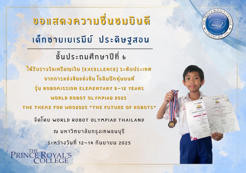 เด็กชายเยเรมีย์ ประดิษฐสอน รางวัลเหรียญเงิน ระดับประเทศ จากการแข่งขันโอลิมปิกหุ่นยนต์ World Robot Olympiad 2025