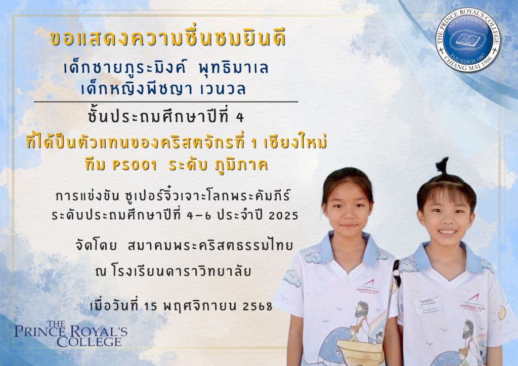 ขอแสดงความยินดีกับ เด็กชายภูระมิงค์ พุทธิมาเล เด็กหญิงพีชญา เวนวล นักเรียนชั้นประถมศึกษาปีที่ 4