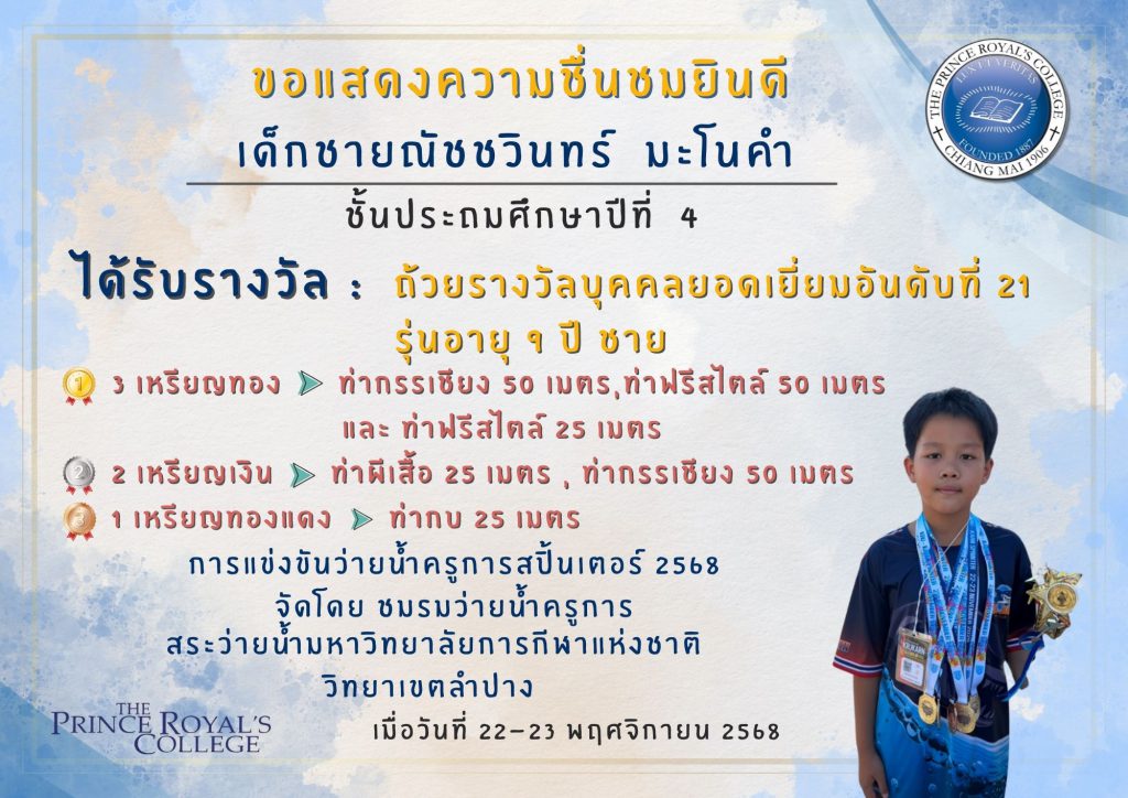 เด็กชายณัชชวินทร์ มะโนคำ : รางวัลบุคคลยอดเยี่ยมอันดับที่ 21 รุ่นอายุ 9 ปี ชาย