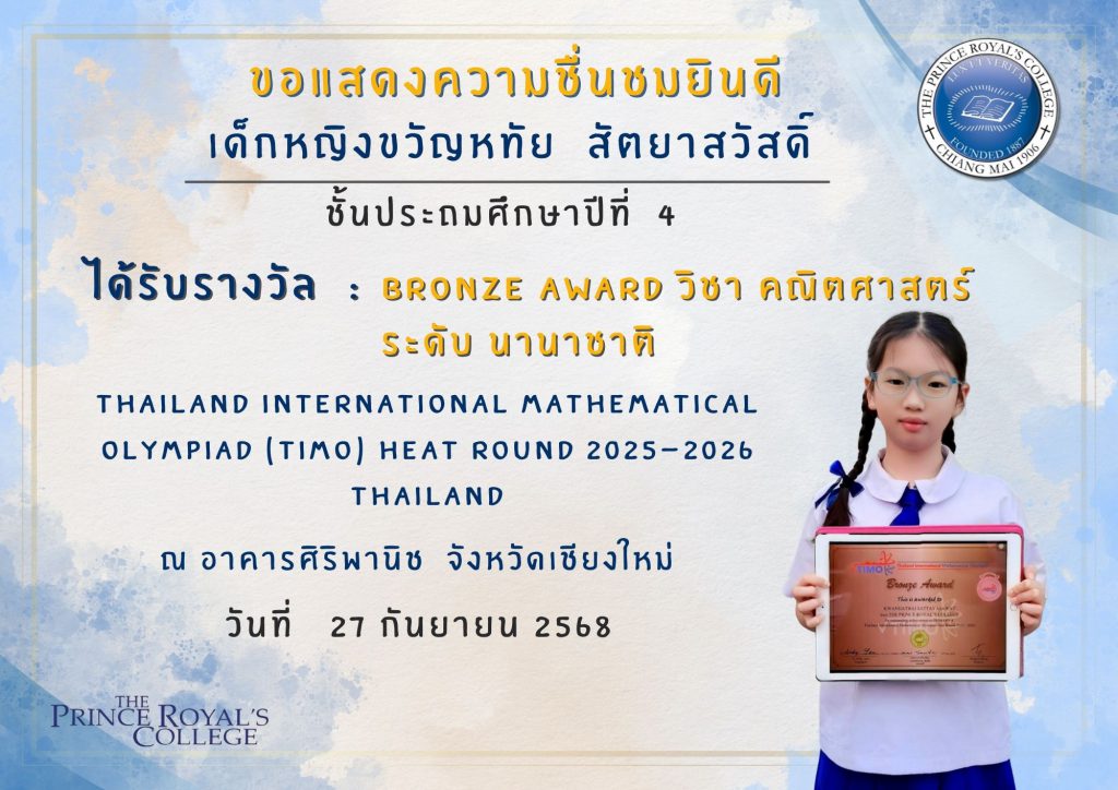 เด็กหญิงขวัญหทัย สัตยาสวัสดิ์ : รางวัล Bronze Award วิชา คณิตศาสตร์ ระดับ นานาชาติ