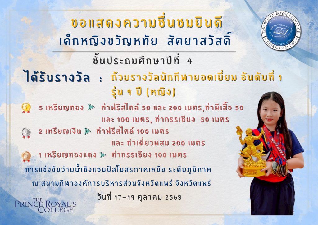 เด็กหญิงขวัญหทัย สัตยาสวัสดิ์ : รางวัลนักกีฬาว่ายน้ำยอดเยี่ยม อันดับที่ 1 รุ่น 9 ปี (หญิง)