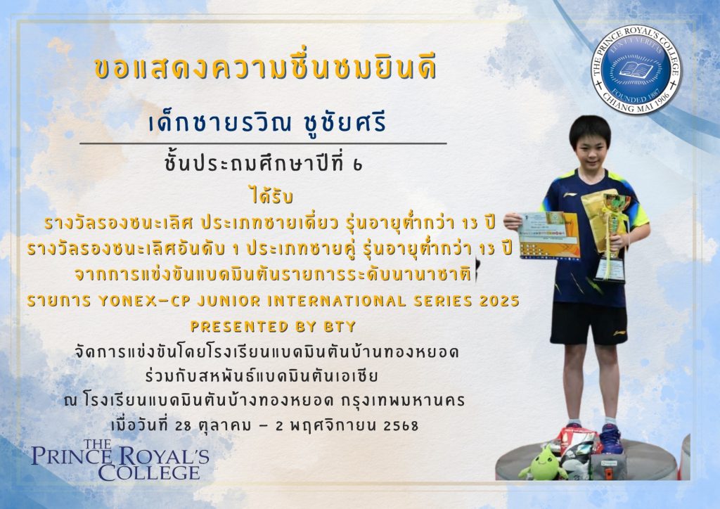 เด็กชายรวิณ ชูชัยศรี รางวัลรองชนะเลิศ ประเภทชายเดี่ยว รุ่นอายุต่ำกว่า 13 ปี รางวัลรองชนะเลิศอันดับ 1 ประเภทชายคู่ รุ่นอายุต่ำกว่า 13 ปี จากการแข่งขันแบดมินตันรายการระดับนานาชาติ รายการ YONEX-CP Junior International Series 2025 Presented by BTY