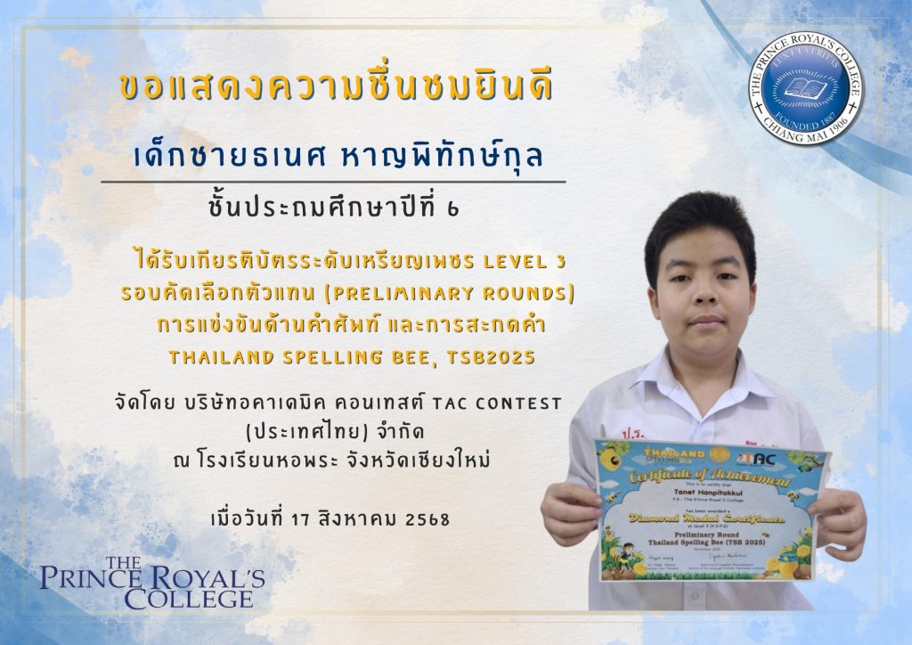 เด็กชายธเนศ หาญพิทักษ์กุล เกียรติบัตรระดับเหรียญเพชร Level 3 รอบคัดเลือกตัวแทน (Preliminary Rounds) การแข่งขันด้านคำศัพท์ และการสะกดคำ Thailand Spelling Bee, TSB2025