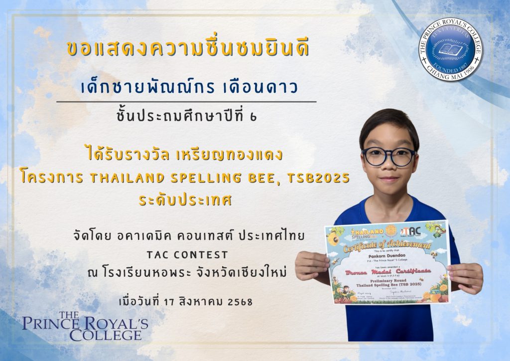 เด็กชายพัณณ์กร เดือนดาว รางวัลเหรียญทองแดง โครงการ Thailand Spelling Bee, TSB2025