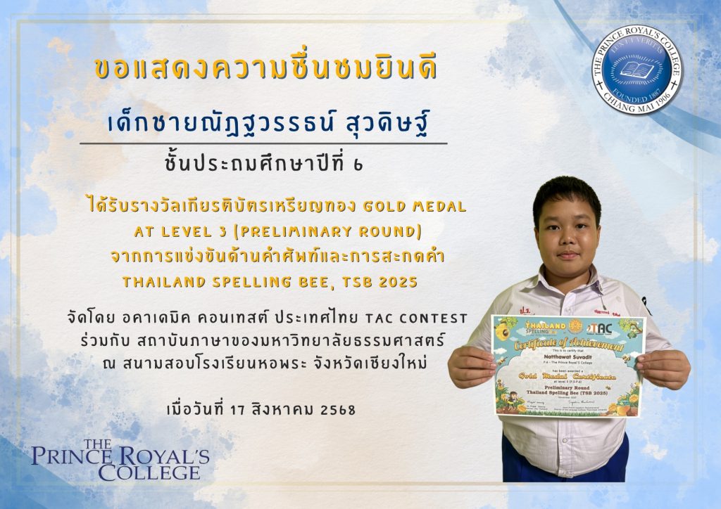 เด็กชายณัฏฐวรรธน์ สุวดิษฐ์ รางวัลเกียรติบัตรเหรียญทอง Gold Medal at Level 3 (Preliminary Round) จากการแข่งขันด้านคำศัพท์และการสะกดคำ Thailand Spelling Bee, TSB 2025