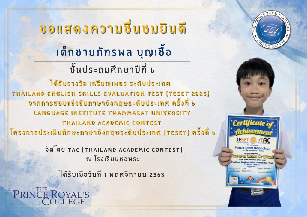 เด็กชายภัทรพล บุญเชื้อ รางวัลเหรียญเพชร ระดับประเทศ Thailand English Skills Evaluation Test (TESET 2025) จากการสอบแข่งขันภาษาอังกฤษระดับประเทศ ครั้งที่ 6