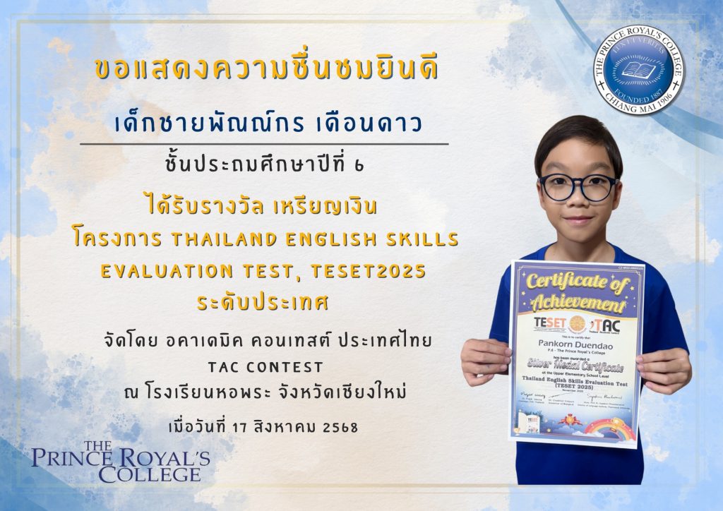 เด็กชายพัณณ์กร เดือนดาว รางวัลเหรียญเงิน โครงการ Thailand English skills Evaluation Test, TESET2025