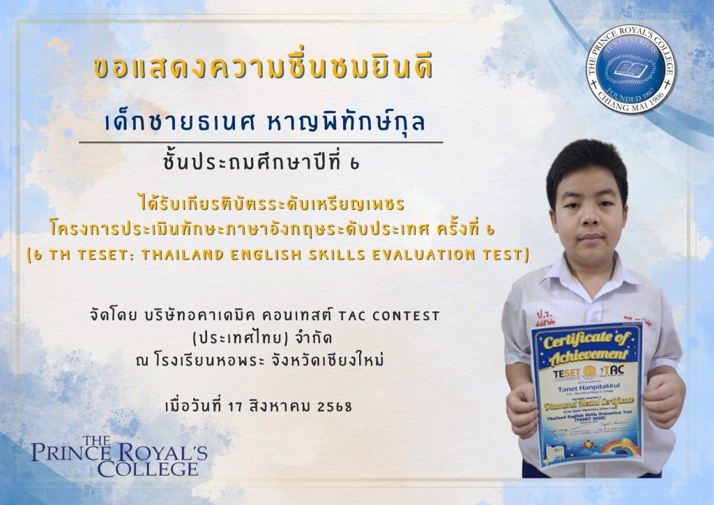 เด็กชายณัฏฐวรรธน์ สุวดิษฐ์ รางวัลเกียรติบัตรเหรียญทอง (Gold Medal) จากโครงการประเมินทักษะภาษาอังกฤษระดับประเทศ ครั้งที่ 6 Thailand English Skills Evaluation Test, TESET2025