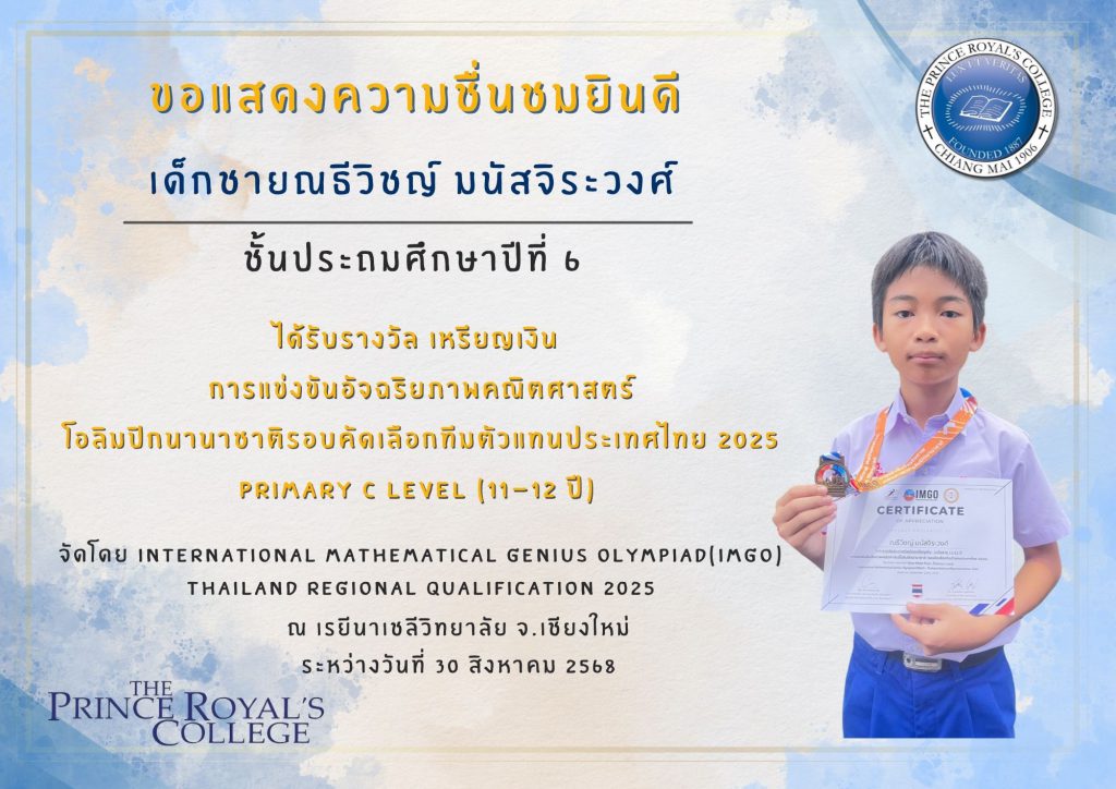 การแข่งขันอัจฉริยภาพคณิตศาสตร์โอลิมปิกนานาชาติรอบคัดเลือกทีมตัวแทนประเทศไทย 2025 เด็กชายณธีวิชญ์ มนัสจิระวงศ์