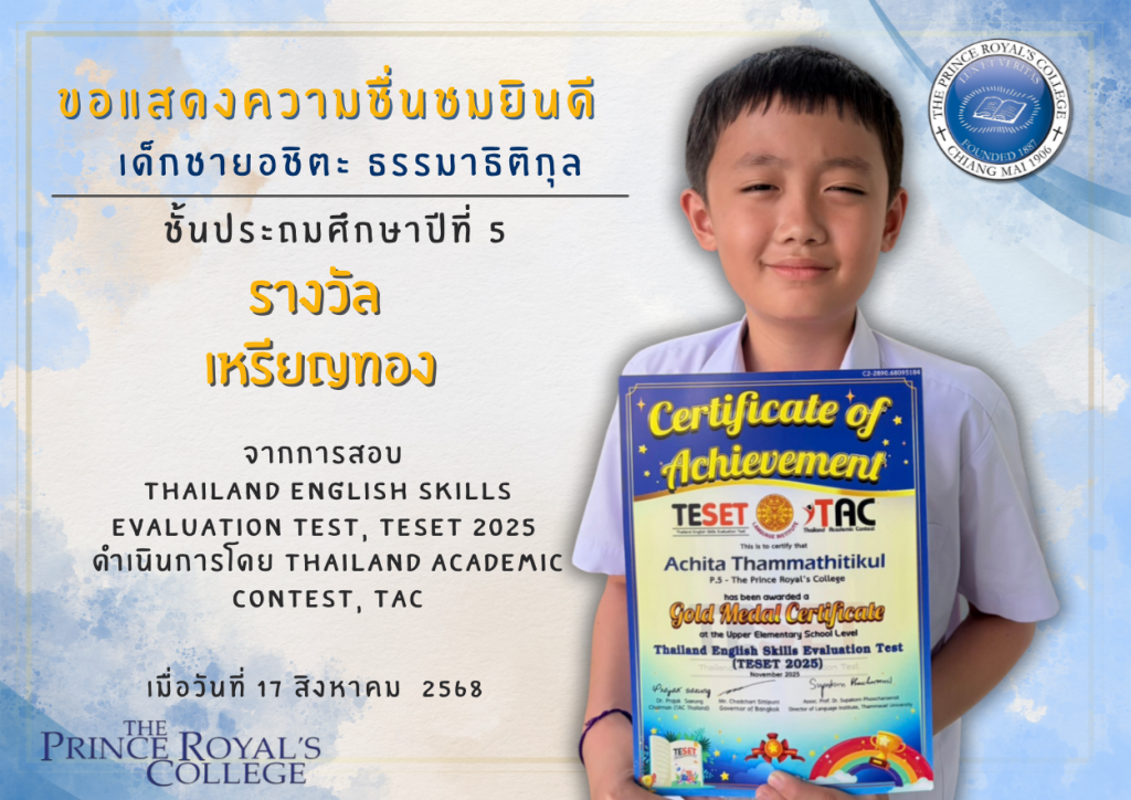 เด็กชายอชิตะ ธรรมาธิติกุล รางวัลเหรียญทอง Thailand English Skills Evaluation Test, TESET 2025 ดำเนินการโดย Thailand Academic Contest, TAC