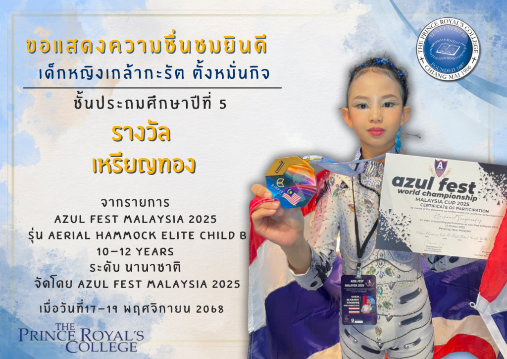 เด็กหญิงเกล้ากะรัต ตั้งหมั่นกิจ ชนะเลิศ เหรียญทอง รายการ Azul Fest Malaysia 2025 รุ่น Aerial Hammock Elite Child B 10-12 Years ระดับ นานาชาติ