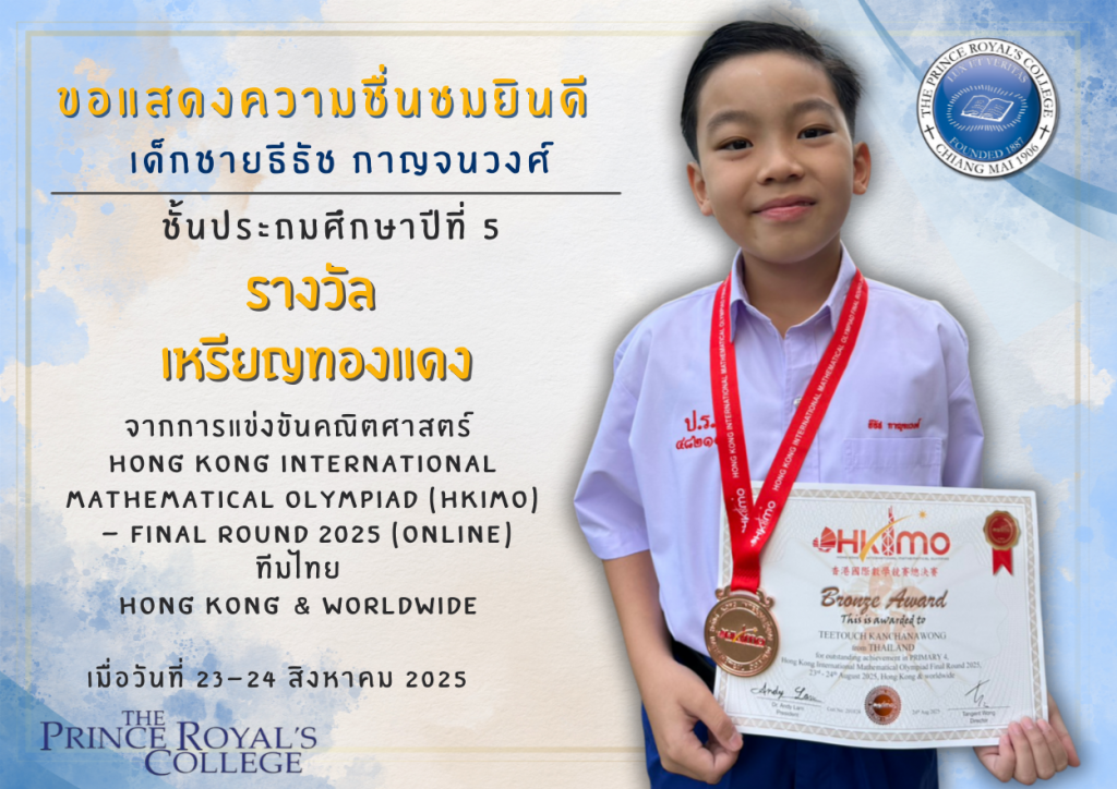 เด็กชายธีธัช กาญจนวงศ์ เหรียญทองแดง การแข่งขันคณิตศาสตร์ Hong Kong International Mathematical Olympiad (HKIMO) – Final round 2025 (Online)ทีมไทย Hong Kong & worldwide