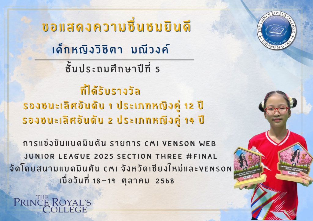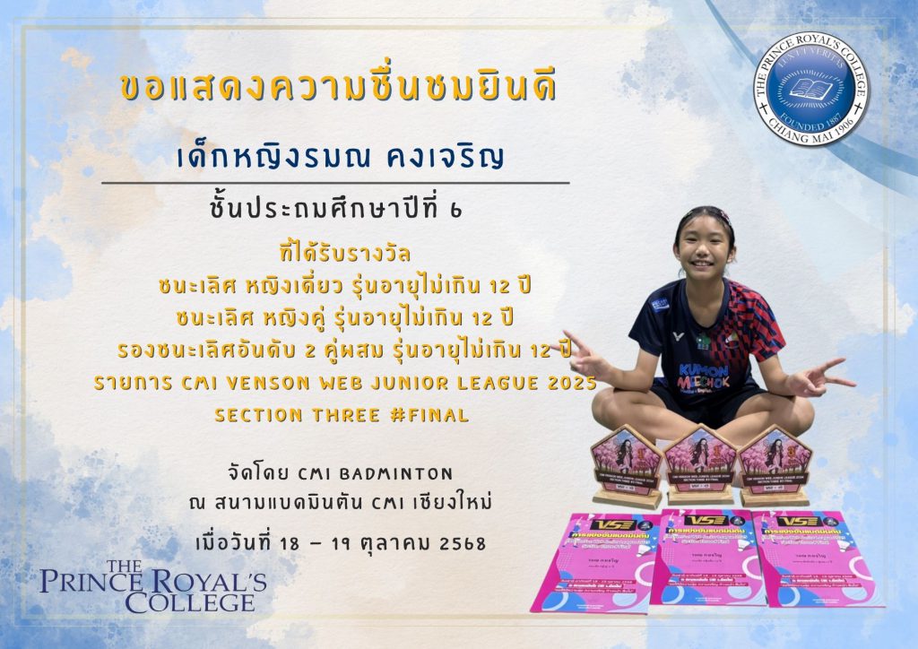 เด็กหญิงรมณ คงเจริญ รางวัลชนะเลิศ หญิงเดี่ยว รุ่นอายุไม่เกิน 12 ปี ชนะเลิศ หญิงคู่ รุ่นอายุไม่เกิน 12 ปี รองชนะเลิศอันดับ 2 คู่ผสม รุ่นอายุไม่เกิน 12 ปี รายการ CMI VenSon Web Junior League 2025 Section Three #Final