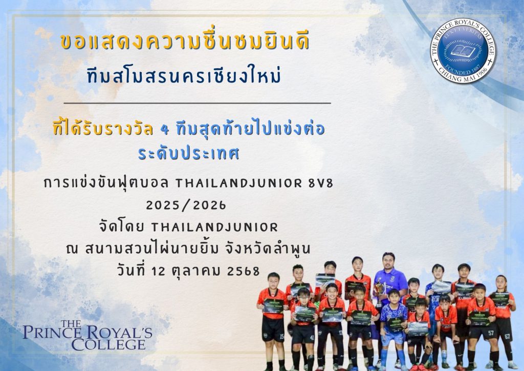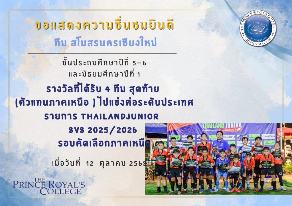 ทีม สโมสรนครเชียงใหม่ รางวัล 4 ทีม สุดท้าย (ตัวแทนภาคเหนือ ) ไปแข่งต่อ ระดับประเทศ รายการ THAILANDJUNIOR 8v8 2025/2026