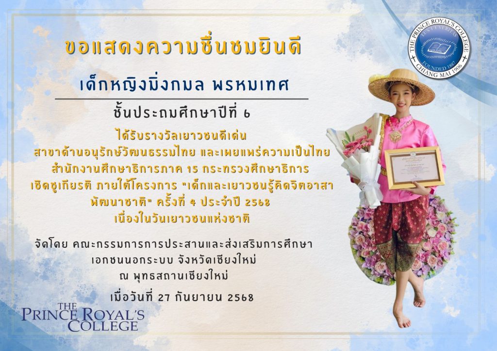 เด็กหญิงมิ่งกมล พรหมเทศ รางวัลเยาวชนดีเด่น สาขาด้านอนุรักษ์วัฒนธรรมไทย และเผยแพร่ความเป็นไทย