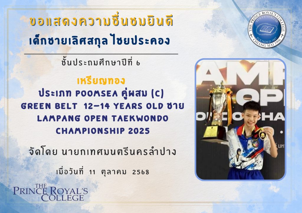 เด็กชายเลิศสกุล ไชยประคอง รางวัล เหรียญทอง Lampang open Taekwondo Championship 2025