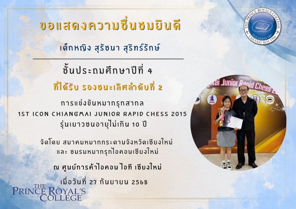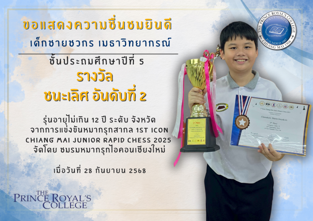 เด็กชายชวกร เมธาวิทยากรณ์ นักเรียนระดับชั้นประถมศึกษาปีที่ 5 รางวัล ชนะเลิศ อันดับที่ 2 การแข่งขันหมากรุกสากล 1st Icon Chiang Mai Junior Rapid Chess 2025