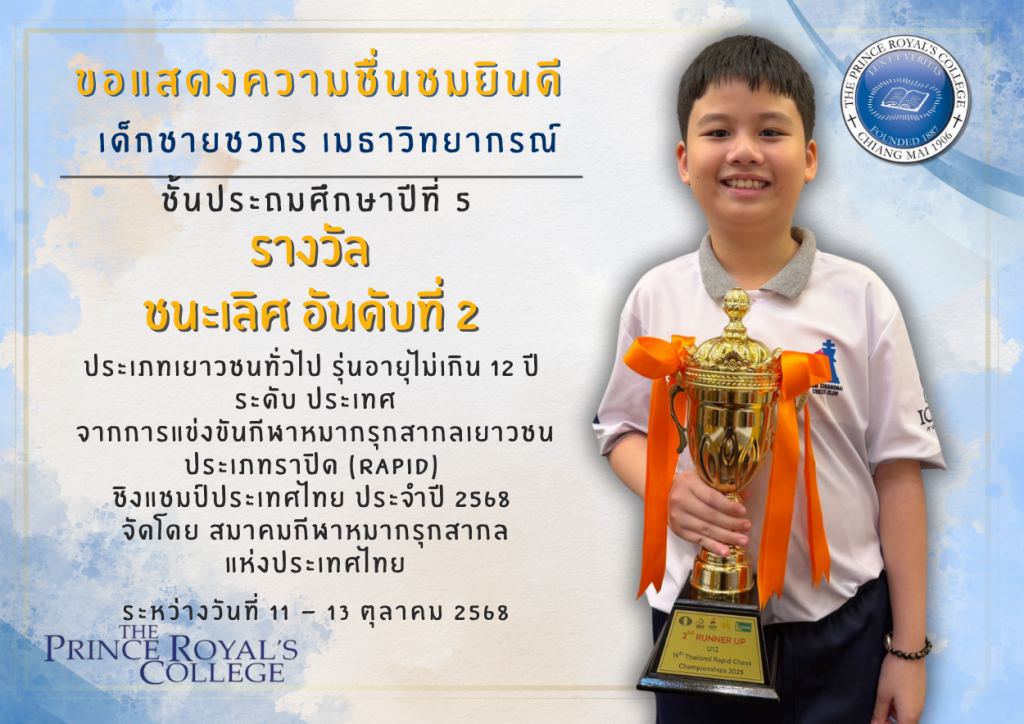 เด็กชายชวกร เมธาวิทยากรณ์ นักเรียนระดับชั้นประถมศึกษาปีที่ 5 รางวัลรองชนะเลิศอันดับ 2 การแข่งขันกีฬาหมากรุกสากลเยาวชนประเภทราปิด (Rapid) ชิงแชมป์ประเทศไทย ประจำปี 2568