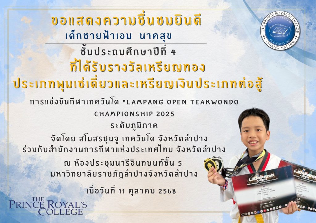 ขอแสดงความยินดีกับ เด็กชายฟ้าเอม นาคสุขที่ได้รับรางวัลเหรียญทองจากการแข่งขันกีฬาเทควันโ