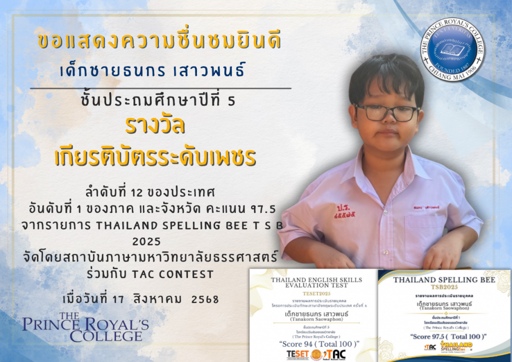 เด็กชายธนกร เสาวพนธ์ นักเรียนระดับชั้นประถมศึกษาปีที่ 5 รางวัลเกียรติบัตรระดับเพชร รายการ Thailand Spelling Bee T S B 2025