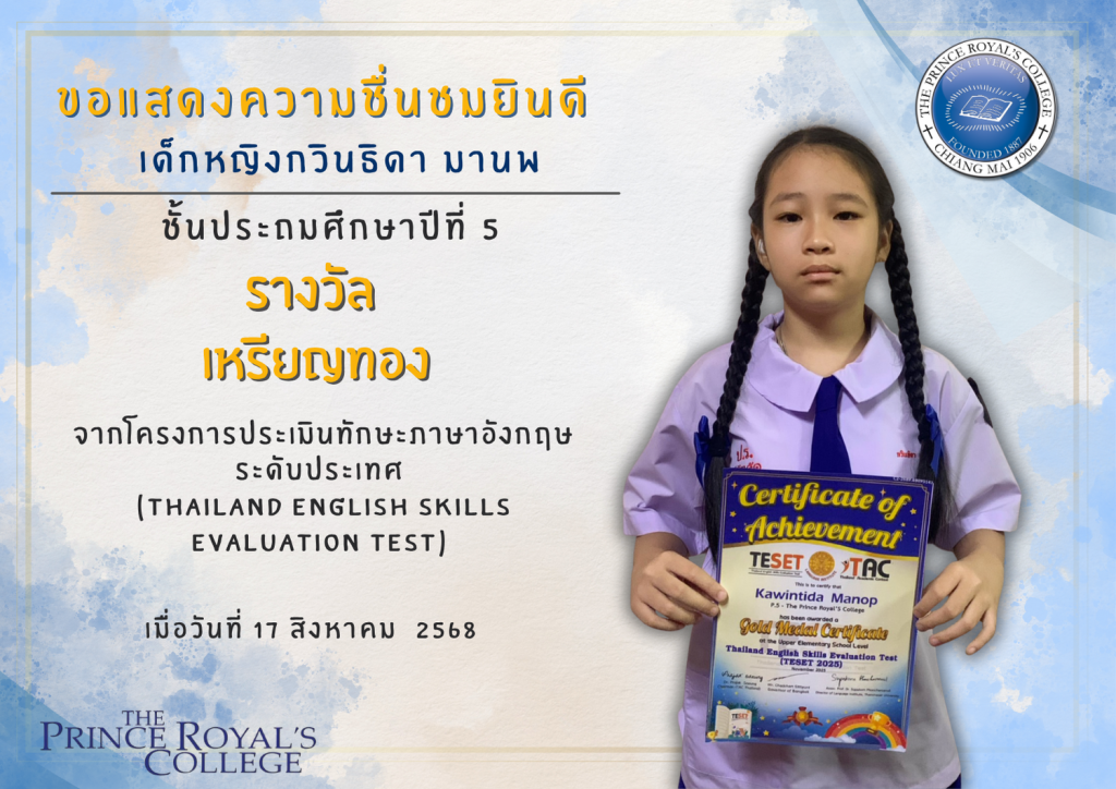 เด็กหญิงกวินธิดา มานพ รางวัล เหรียญทอง จากโครงการประเมินทักษะภาษาอังกฤษระดับประเทศ (Thailand English Skills Evaluation Test) หรือ TESET ระดับ ประเทศ