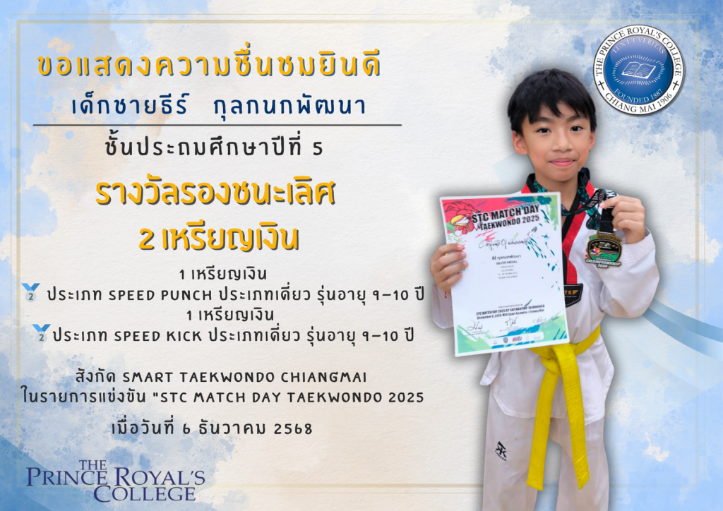 เด็กชายธีร์ กุลกนกพัฒนา นักเรียนชั้นประถมศึกษาปีที่ 5 รางวัล 2 เหรียญเงิน รายการแข่งขัน “STC MATCH DAY TAEKWONDO 2025