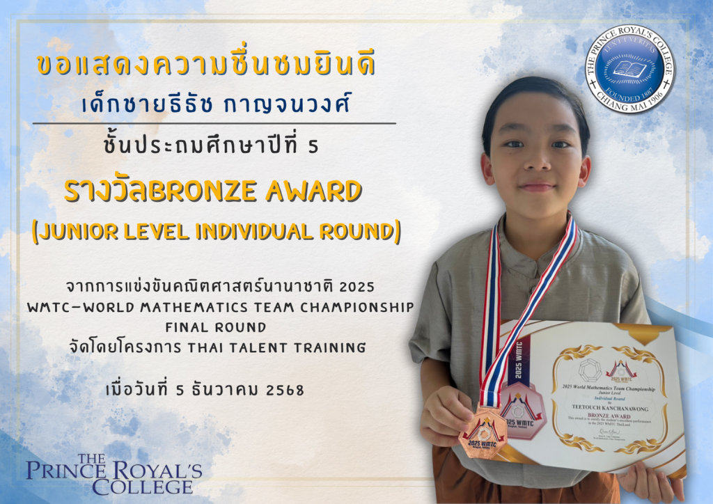 เด็กชายธีธัช กาญจนวงศ์ รางวัล Bronze Award (Junior Level Individual Round) จากการแข่งขันคณิตศาสตร์นานาชาติ 2025WMTC-World Mathematics Team Championship final round