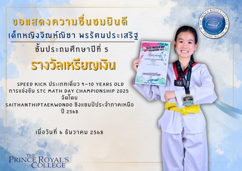 เด็กหญิงจิณห์ณิชา พรรัตนประเสริฐ รางวัล เหรียญเงิน SPEED KICK ประเภทเดี่ยว 9-10 YEARS OLD การแข่งขัน STC MATH DAY Championship 2025 By SaithanthipTaekwondo ชิงแชมป์ประจำภาคเหนือปี 2568
