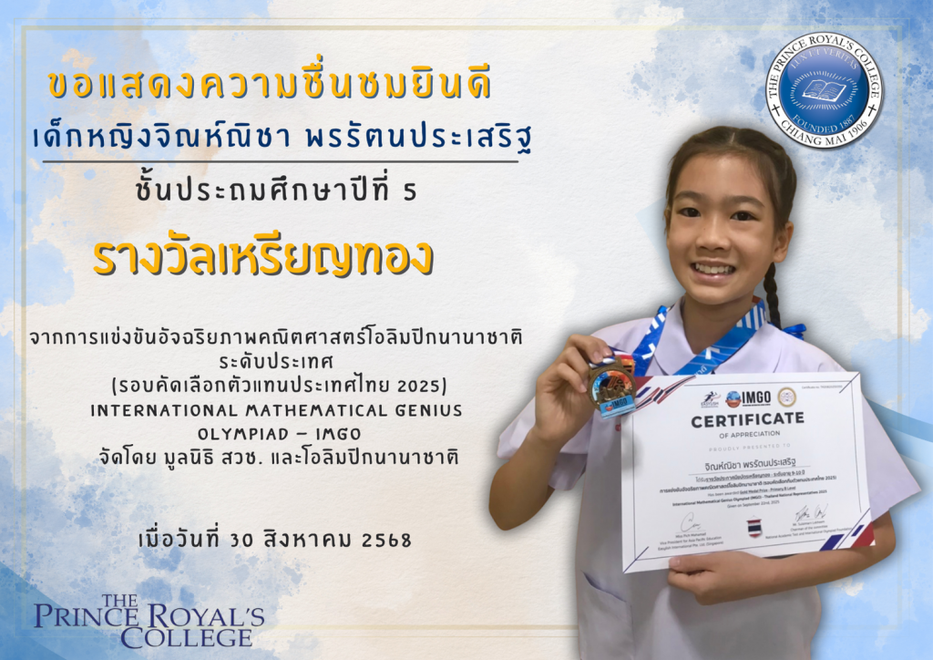 เด็กหญิงจิณห์ณิชา พรรัตนประเสริฐ รางวัลเหรียญทอง ระดับอายุ 9-10 ปี (ผ่านเข้าสู่รอบระดับนานาชาติ) จากการแข่งขันอัจฉริยภาพคณิตศาสตร์โอลิมปิกนานาชาติ ระดับประเทศ (รอบคัดเลือกตัวแทนประเทศไทย 2025) International Mathematical Genius Olympiad – IMGO