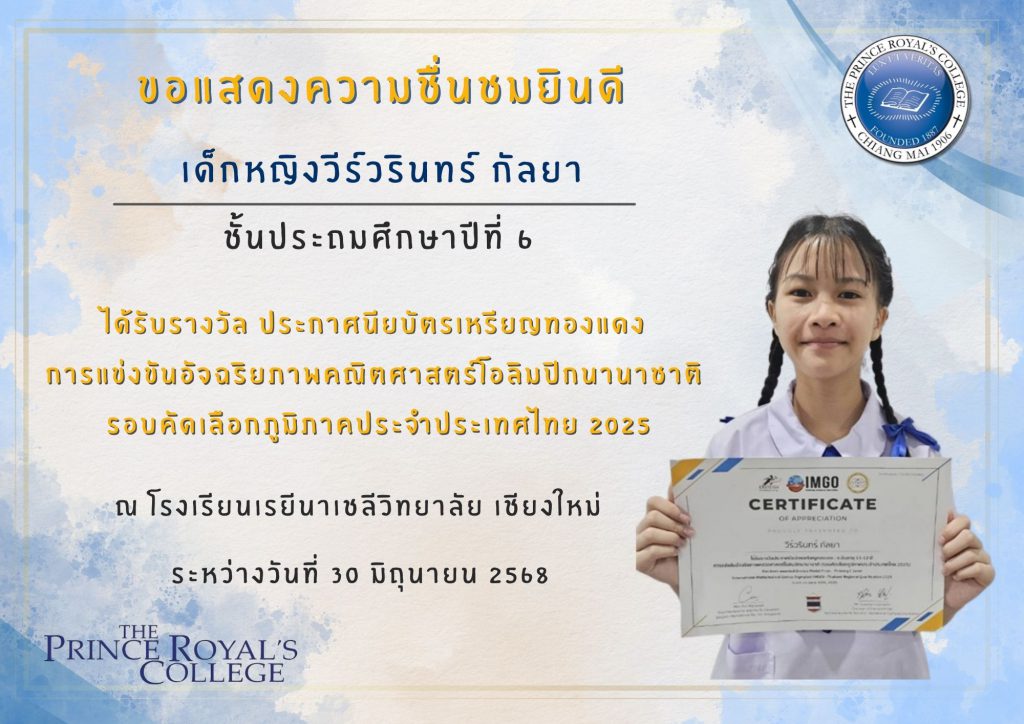 เด็กหญิงวีร์วรินทร์ กัลยา การแข่งขันอัจฉริยภาพคณิตศาสตร์โอลิมปิกนานาชาติ รอบคัดเลือกภูมิภาคประจำประเทศไทย 2025