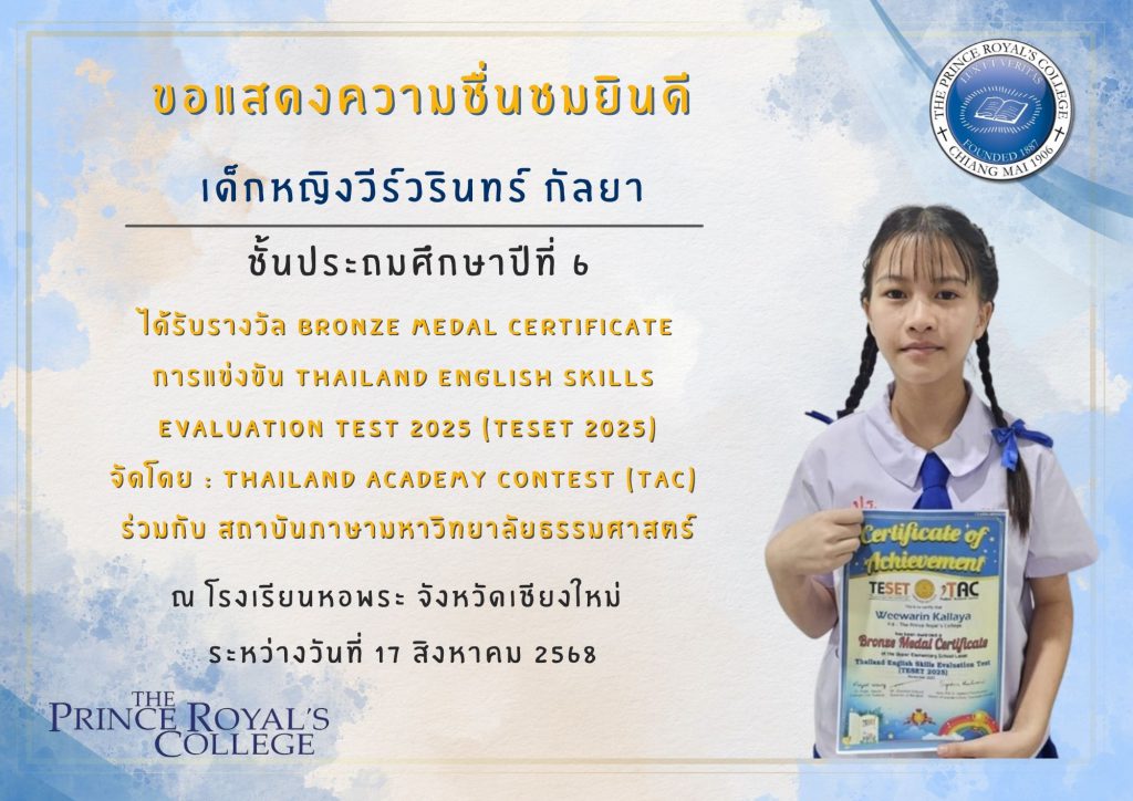 เด็กหญิงวีร์วรินทร์ กัลยา Thailand English Skills Evaluation Test 2025 (TESET 2025)