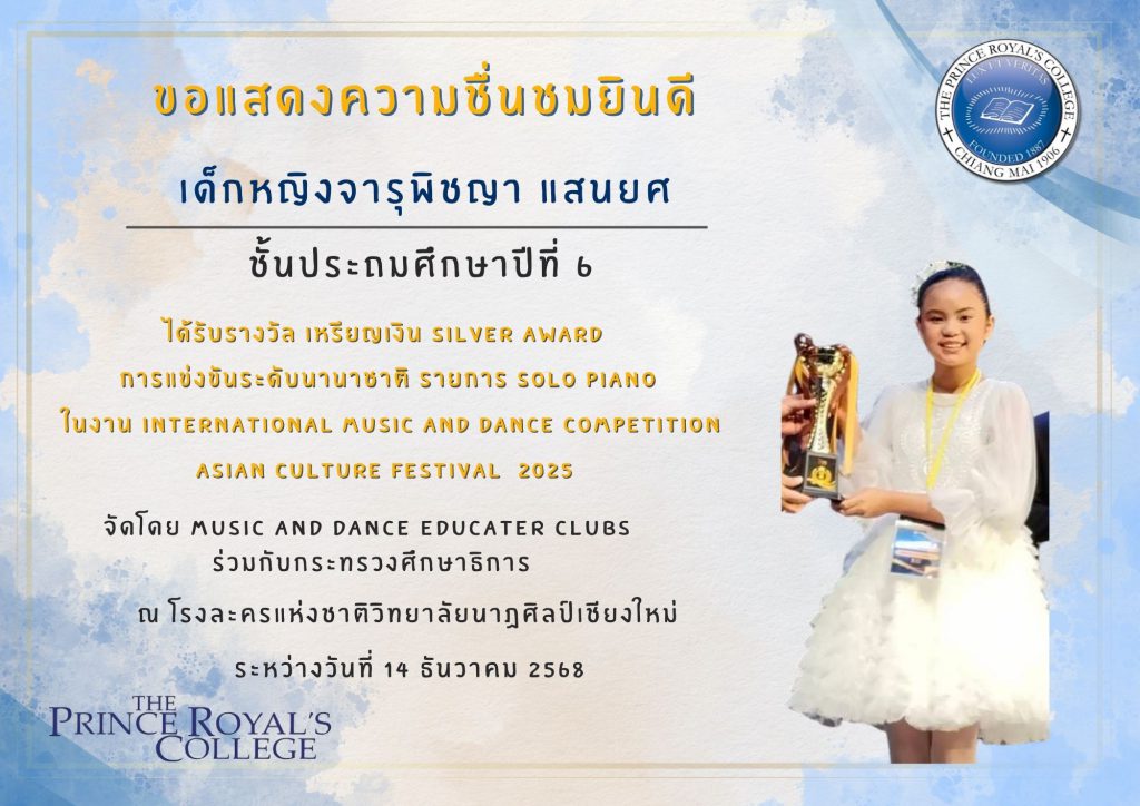 เด็กหญิงจารุพิชญา แสนยศ การแข่งขันระดับนานาชาติ Solo Piano International Music And Dance Competition Asian Culture Festival 2025