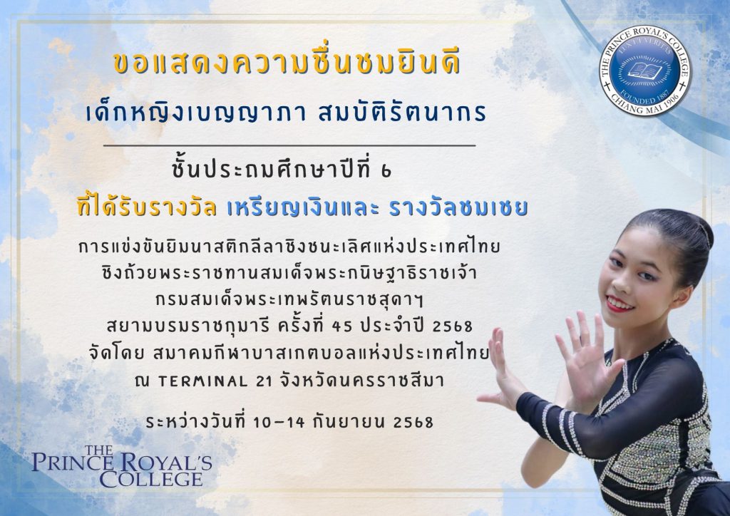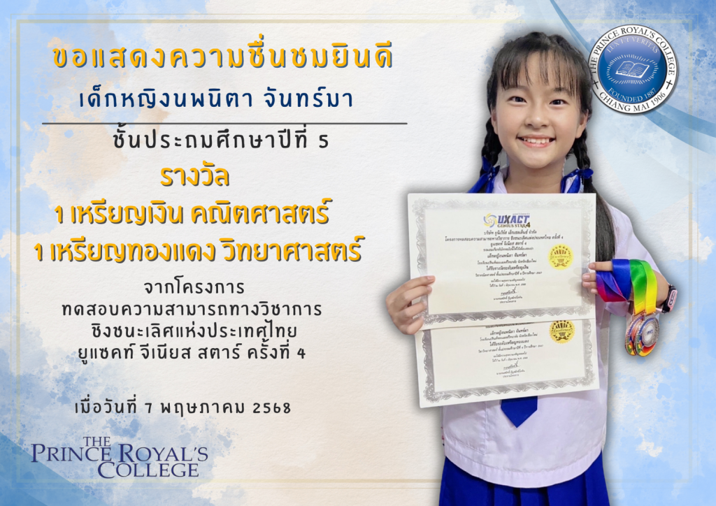 เด็กชายพลินทร์ รัตน์วุฒิกุล รางวัลเหรียญเงิน จากการแข่งขันอัจฉริยภาพคณิตศาสตร์โอลิมปิกนานาชาติ รอบคัดเลือกภูมิภาคประจำประเทศไทย 2025