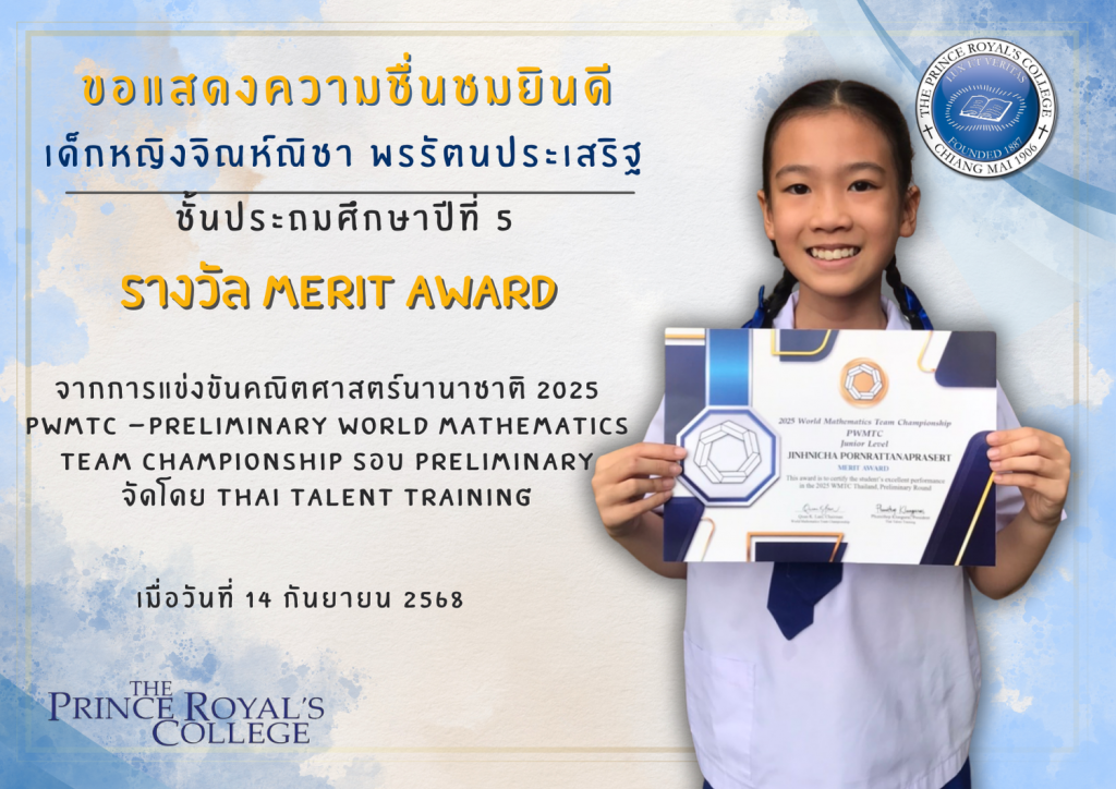 เด็กหญิงจิณห์ณิชา พรรัตนประเสริฐ รางวัล MERIT AWARD ในระดับ Junior จากการแข่งขันคณิตศาสตร์นานาชาติ 2025 PWMTC –Preliminary World Mathematics Team Championship รอบ Preliminary