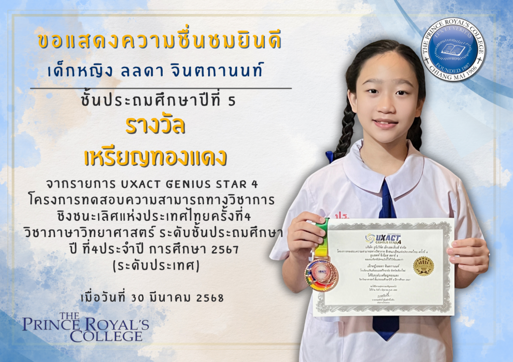 เด็กหญิง ลลดา จินตกานนท์ รางวัล เหรียญทองแดง จากรายการ UXACT GENIUS STAR 4 โครงการทดสอบความสามารถทางวิชาการ ชิงชนะเลิศแห่งประเทศไทยครั้งที่4