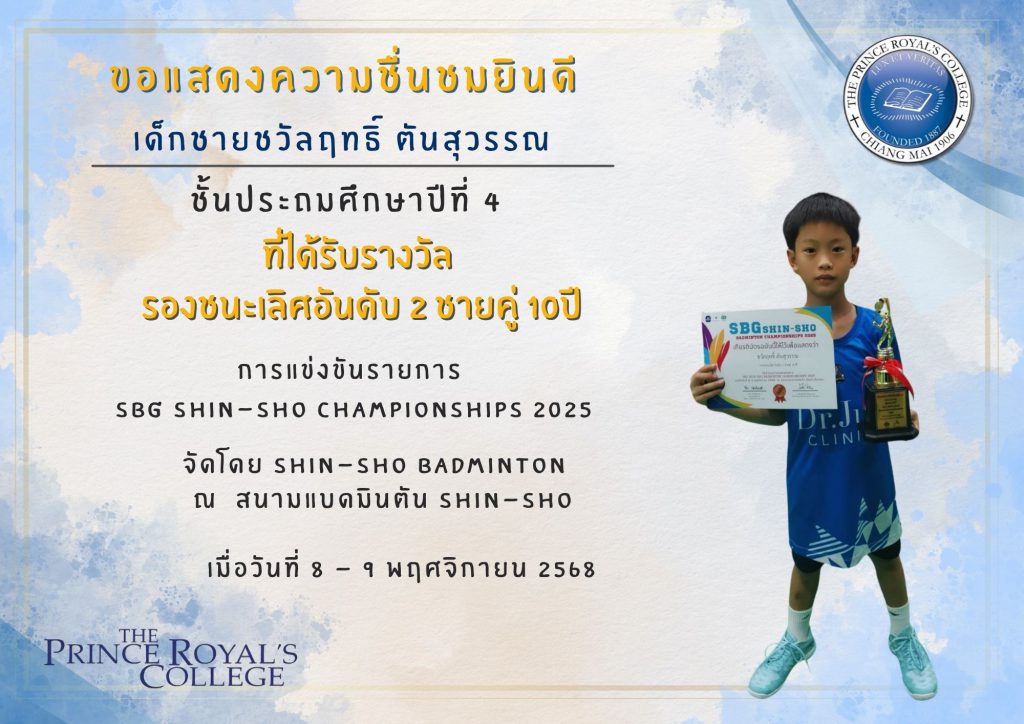 เด็กหญิงรมณ คงเจริญ รางวัลรองชนะเลิศอันดับ 2 หญิงเดี่ยว รุ่นอายุ 12 ปี รองชนะเลิศอันดับ 2 หญิงคู่ รุ่นอายุ 12 ปี จากการแข่งขันแบดมินตัน รายการ SBG Shin-Sho Badminton Championships 2025