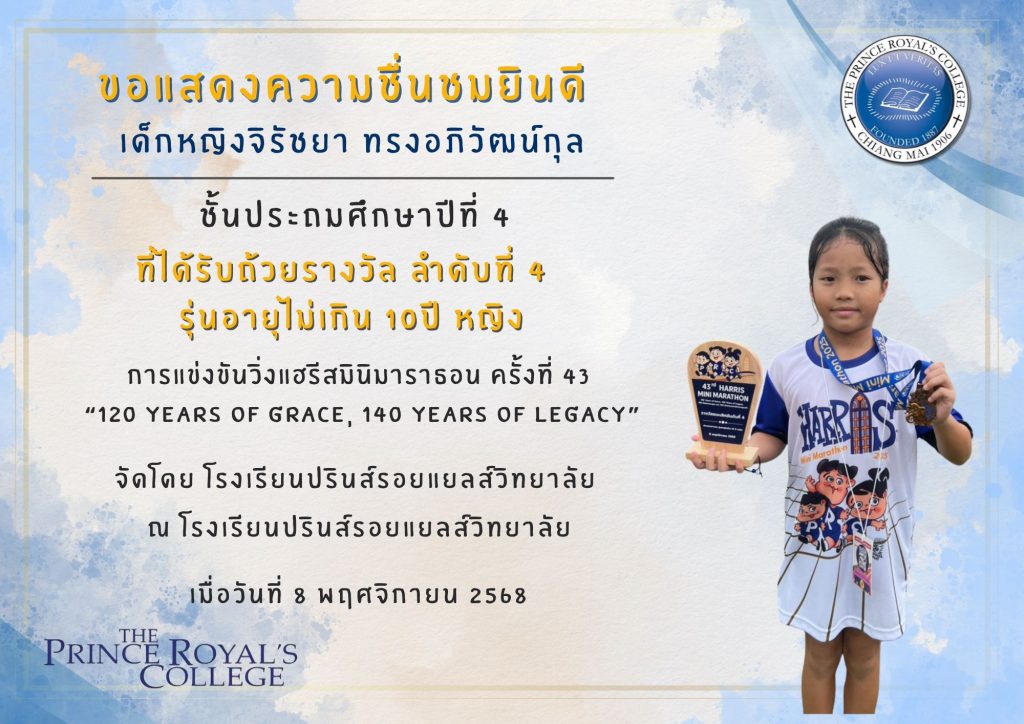 ขอแสดงความยินดีกับ เด็กหญิงจิรัชยา ทรงอภิวัฒน์กุล นักเรียนชั้นประถมศึกษาปีที่ 4