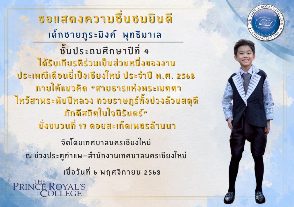 ขอแสดงความยินดีกับ เด็กชายภูระมิงค์ พุทธิมาเล นักเรียนชั้นประถมศึกษาปีที่ 4 ที่ได้รับเกียรติร่วมเป็นส่วนหนึ่งของงาน ประเพณีเดือนยี่เป็งเชียงใหม่