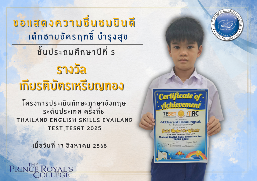 เด็กชายอัครฤทธิ์ บำรุงสุข เกียรติบัตรเหรียญทอง จากโครงการประเมินทักษะภาษาอังกฤษระดับประเทศ ครั้งที่6 Thailand English Skills Evailand Test,TESRT 2025