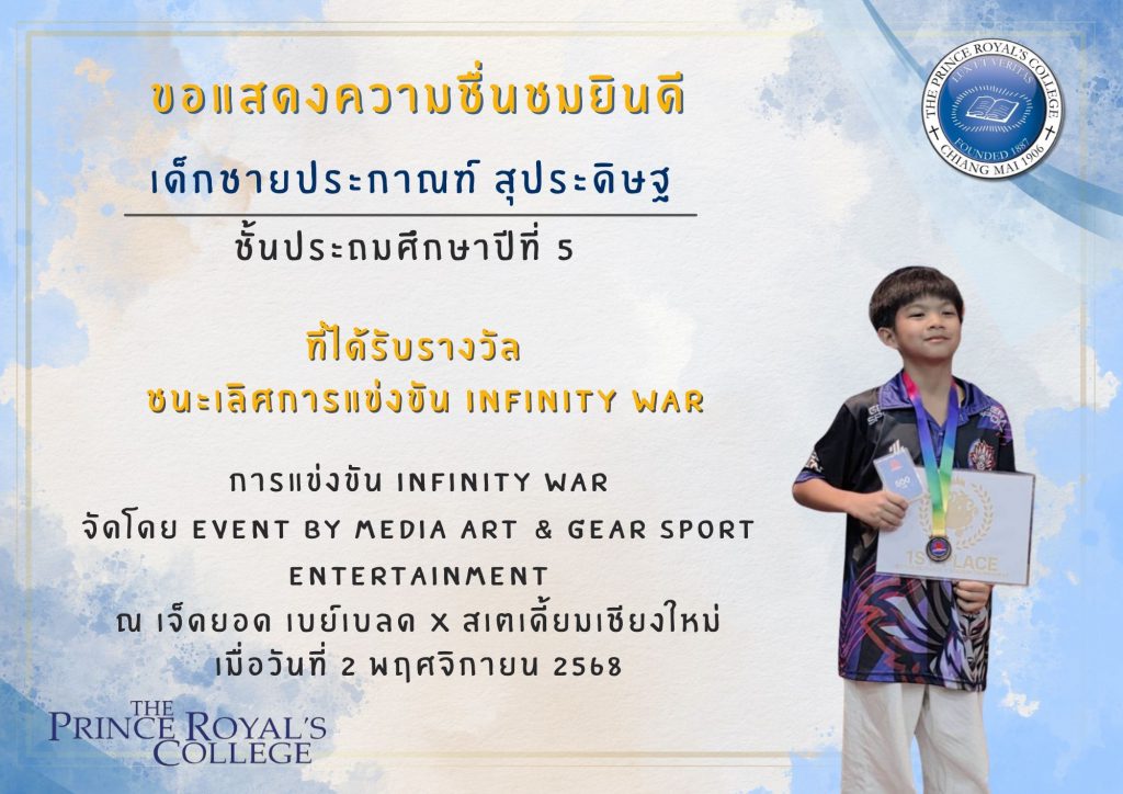 เด็กชายประกาณฑ์ สุประดิษฐ นักเรียนระดับชั้นประถมศึกษาปีที่ 5 ได้รับรางวัล ชนะเลิศการแข่งขัน INFINITY WAR