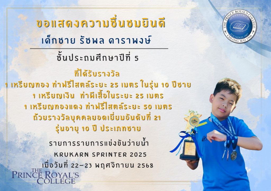 เด็กชายรัชพล ดาราพงษ์ นักเรียนชั้นประถมศึกษาปีที่ 5 รายการแข่งขันว่ายน้ำ KRUKARN Sprinter 2025
