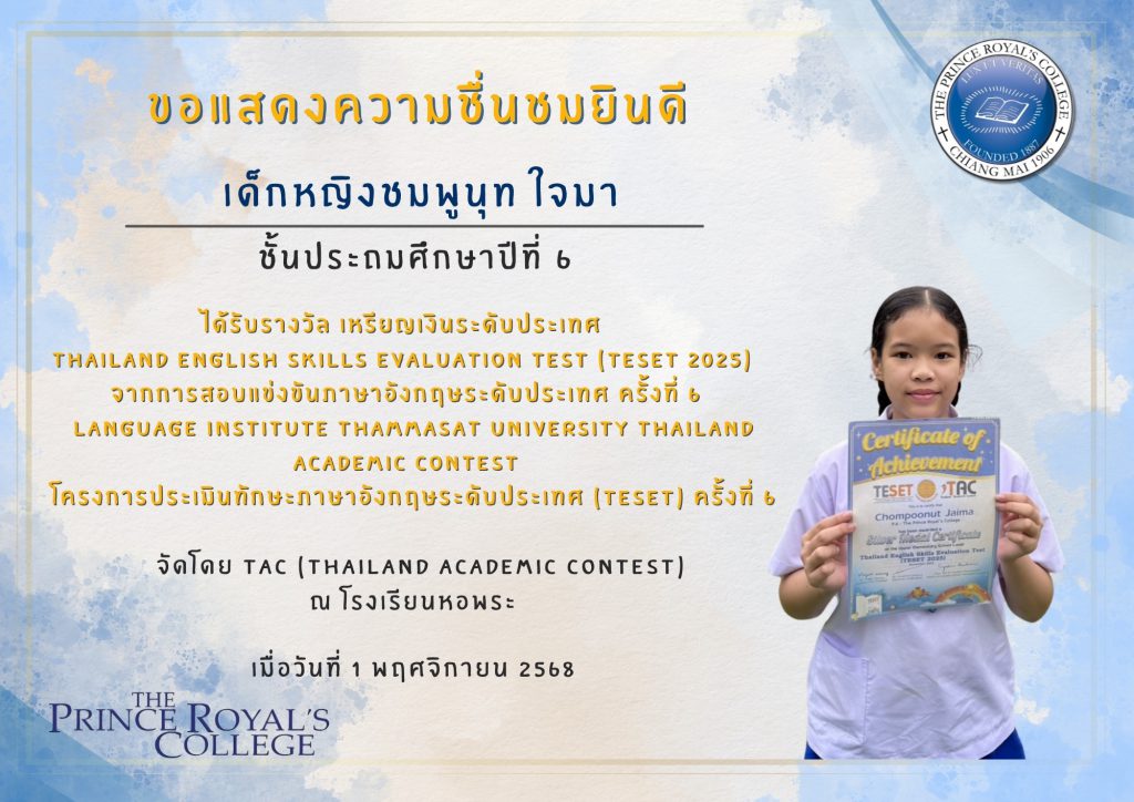 เด็กหญิงชมพูนุท ใจมา รางวัลเหรียญเงินระดับประเทศ Thailand English Skills Evaluation Test (TESET 2025)