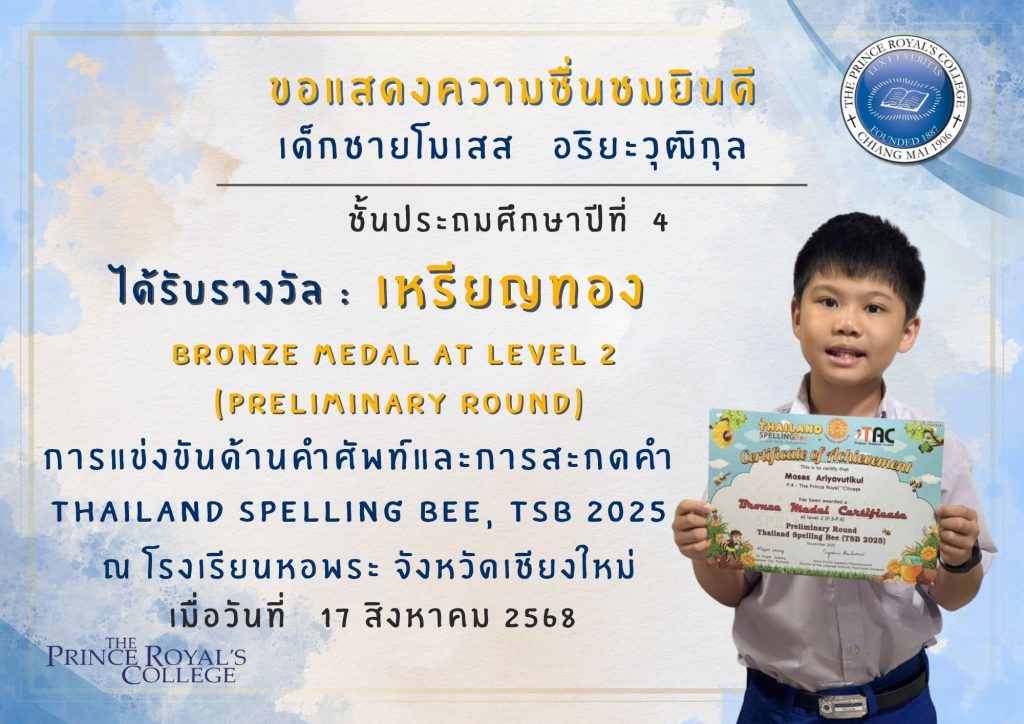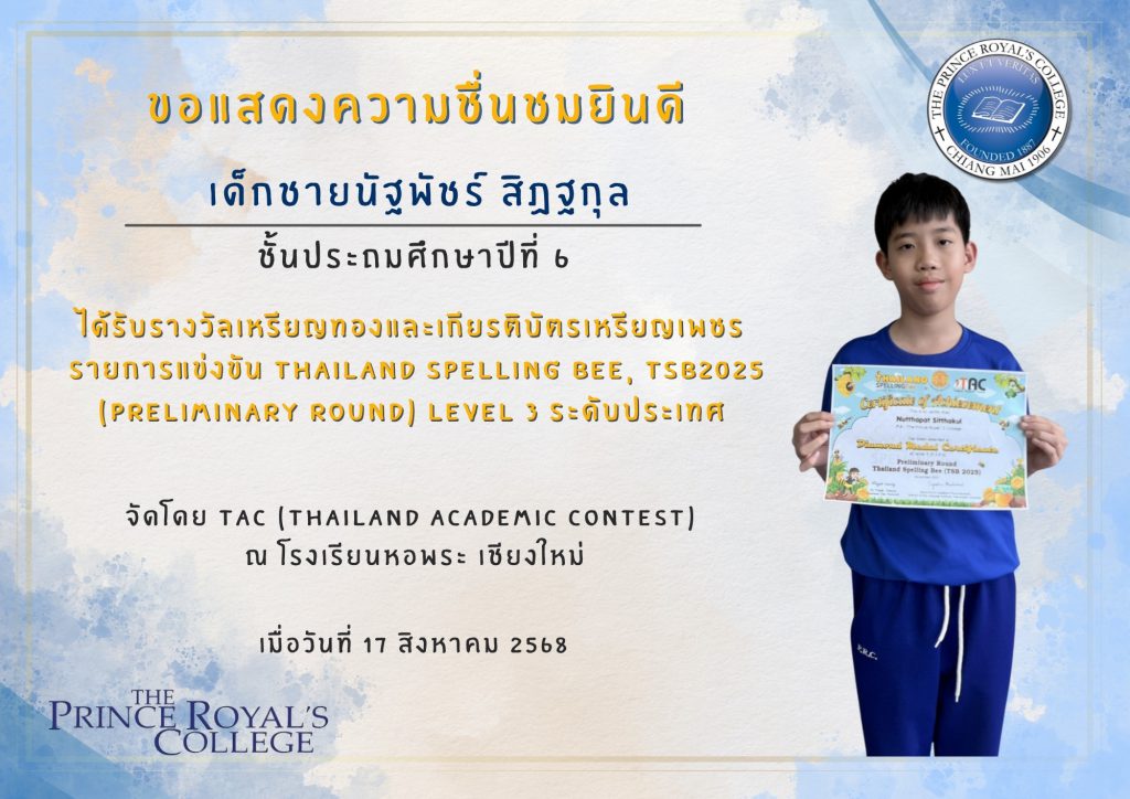 เด็กชายนัฐพัชร์ สิฏฐกุล รางวัลเหรียญทองและเกียรติบัตรเหรียญเพชร รายการแข่งขัน Thailand Spelling Bee, TSB2025 (Preliminary Round) Level 3 ระดับประเทศ