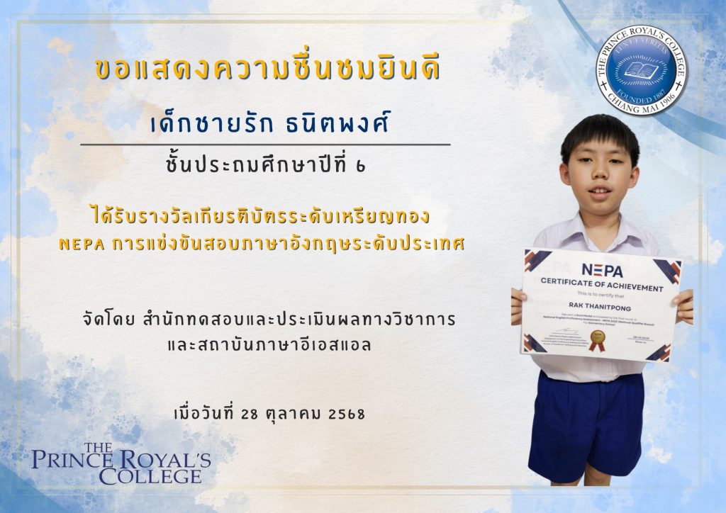 เด็กชายรัก ธนิตพงศ์ รางวัลเกียรติบัตรระดับเหรียญทอง NEPA การแข่งขันสอบภาษาอังกฤษระดับประเทศ