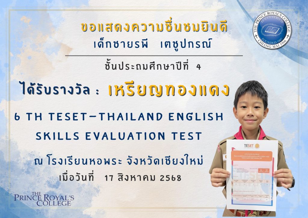 เด็กชายนัฐพัชร์ สิฏฐกุล รางวัลเหรียญทองและเกียรติบัตรเหรียญเพชร รายการแข่งขัน โครงการประเมินทักษะภาษาอังกฤษ ระดับประเทศ ครั้งที่ 6 (ประจําปี 2568) TESET 2025